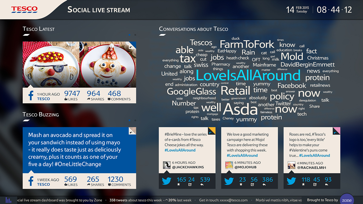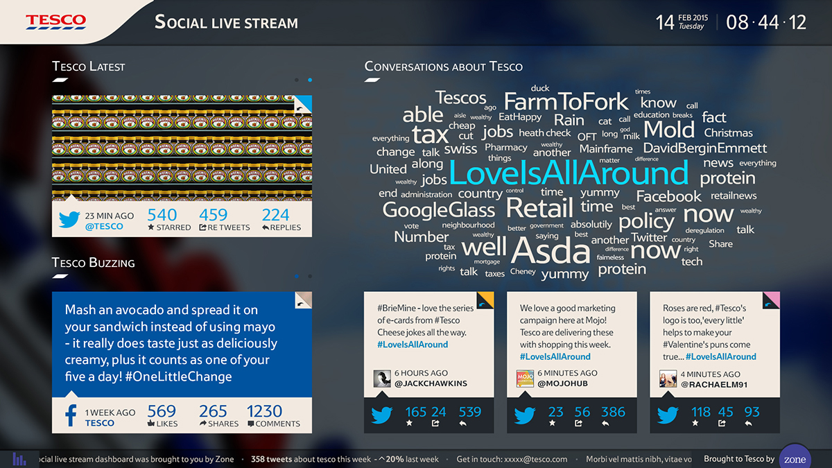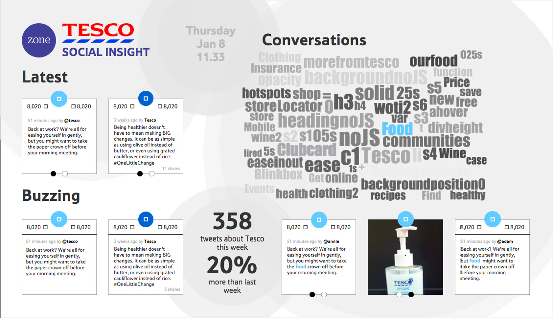 The Tesco dynamic dashboard is a live view of what Tesco is saying in social media – Tesco Twitter and Facebook page(s) – and also what others are saying about Tesco. It was an initiative from the Tesco brand social media team so they could keep an eye on the impact and opportunities social listening and social media can leverage for the business.
